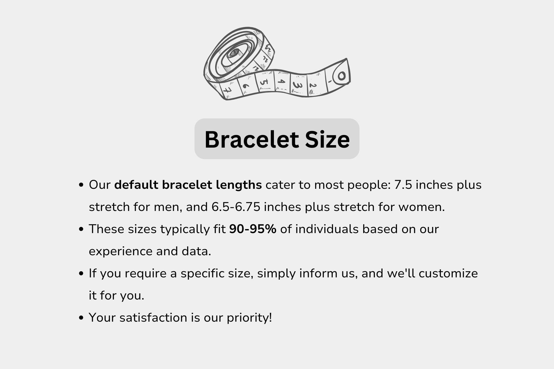Messen Sie einfach Ihren Handgelenkumfang mit einem Zollmaßband und teilen Sie uns diesen mit. Wir fertigen das Armband so an, dass es perfekt zu Ihnen passt!