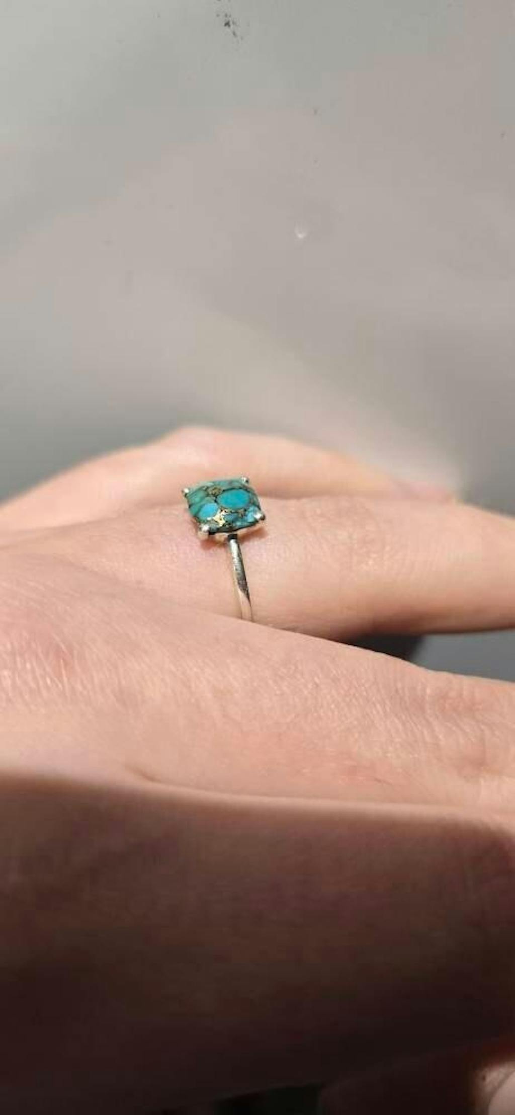 ✦ Unser zierlicher Kupfertürkisring mit einem Stein im Kissenschliff ist ein einzigartiges und atemberaubendes Stück, das sich perfekt für den Alltag oder legere Anlässe eignet.