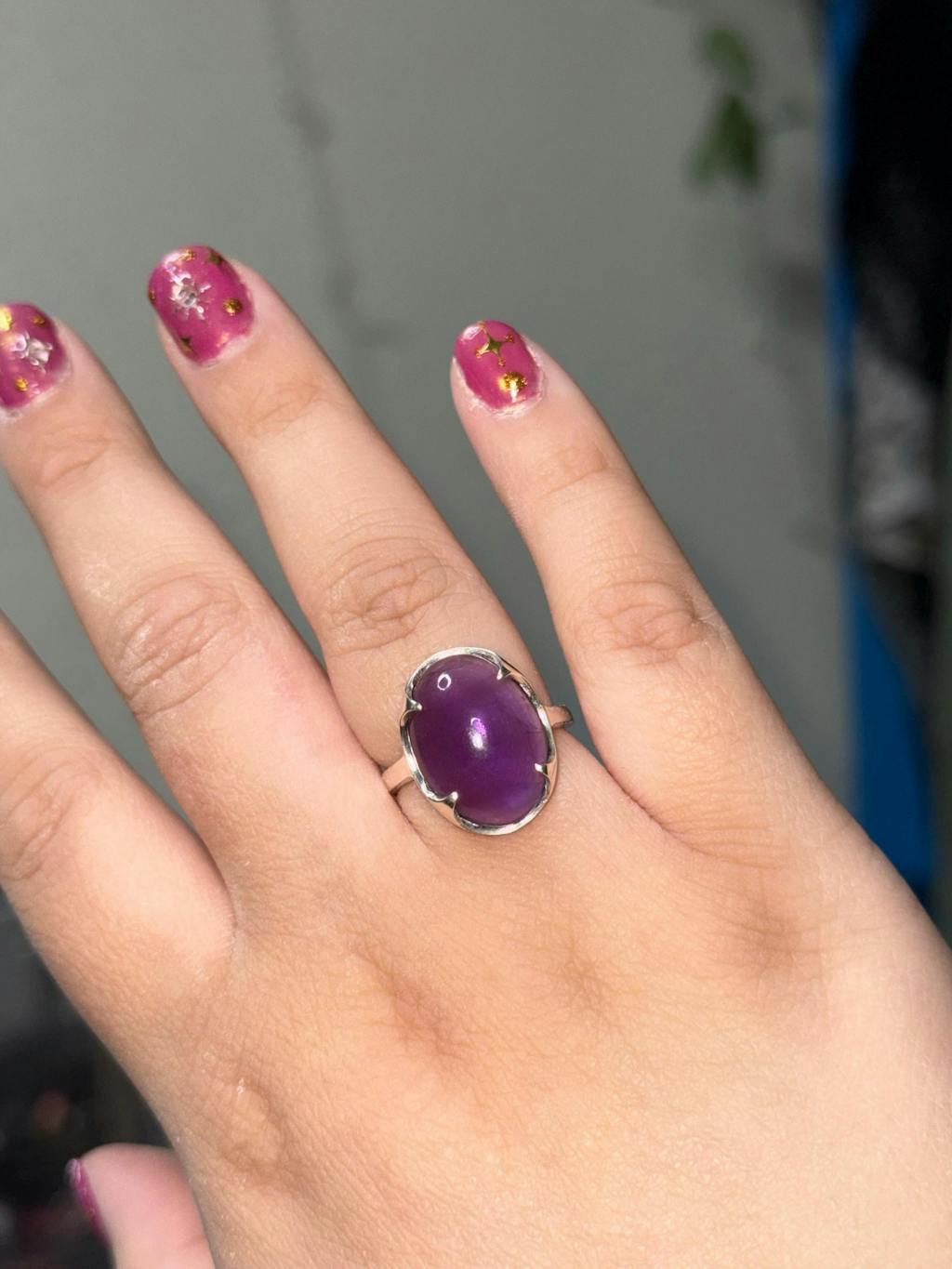 Die tiefen, satten Farbtöne des Amethysts verleihen dem Ring eine einzigartige und majestätische Schönheit, die sowohl fesselnd als auch bezaubernd ist. Die große Größe des Steins macht ihn zu einem mutigen und eindrucksvollen Statement-Stück.