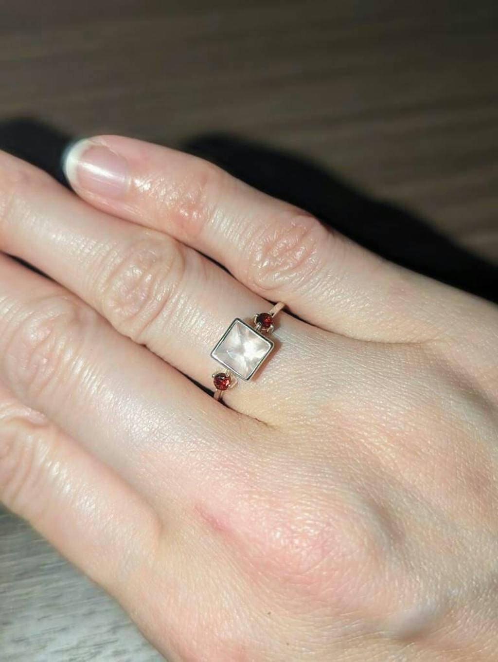Rosenquarz, bekannt als Stein der Liebe, passt wunderbar zu Granat, einem Symbol für Leidenschaft und Energie. Zusammen ergeben sie einen wirklich bezaubernden Ring, der sowohl feminin als auch einzigartig ist.