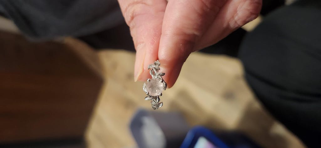 The band is adorned with leafy and twig-style patterns, evoking natural beauty and rustic charm. The soft pink hues of the rose quartz are perfectly complemented by the organic shapes and textures of the band, creating a unique and captivating effect sure to turn heads.