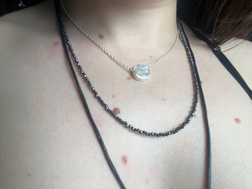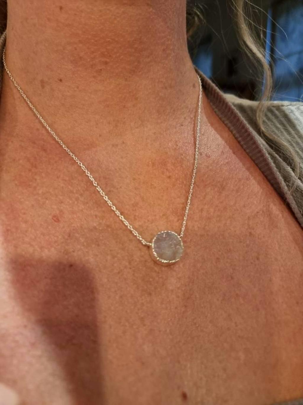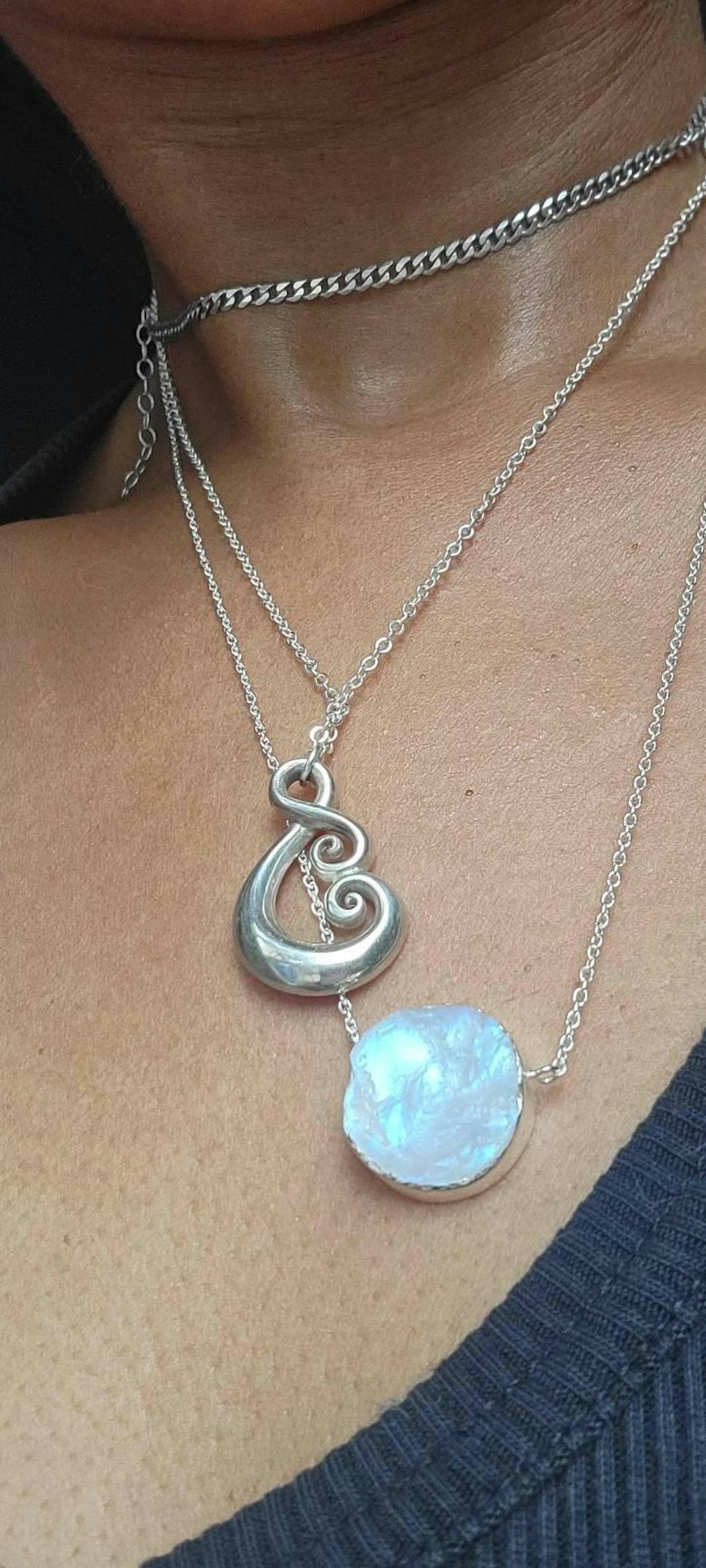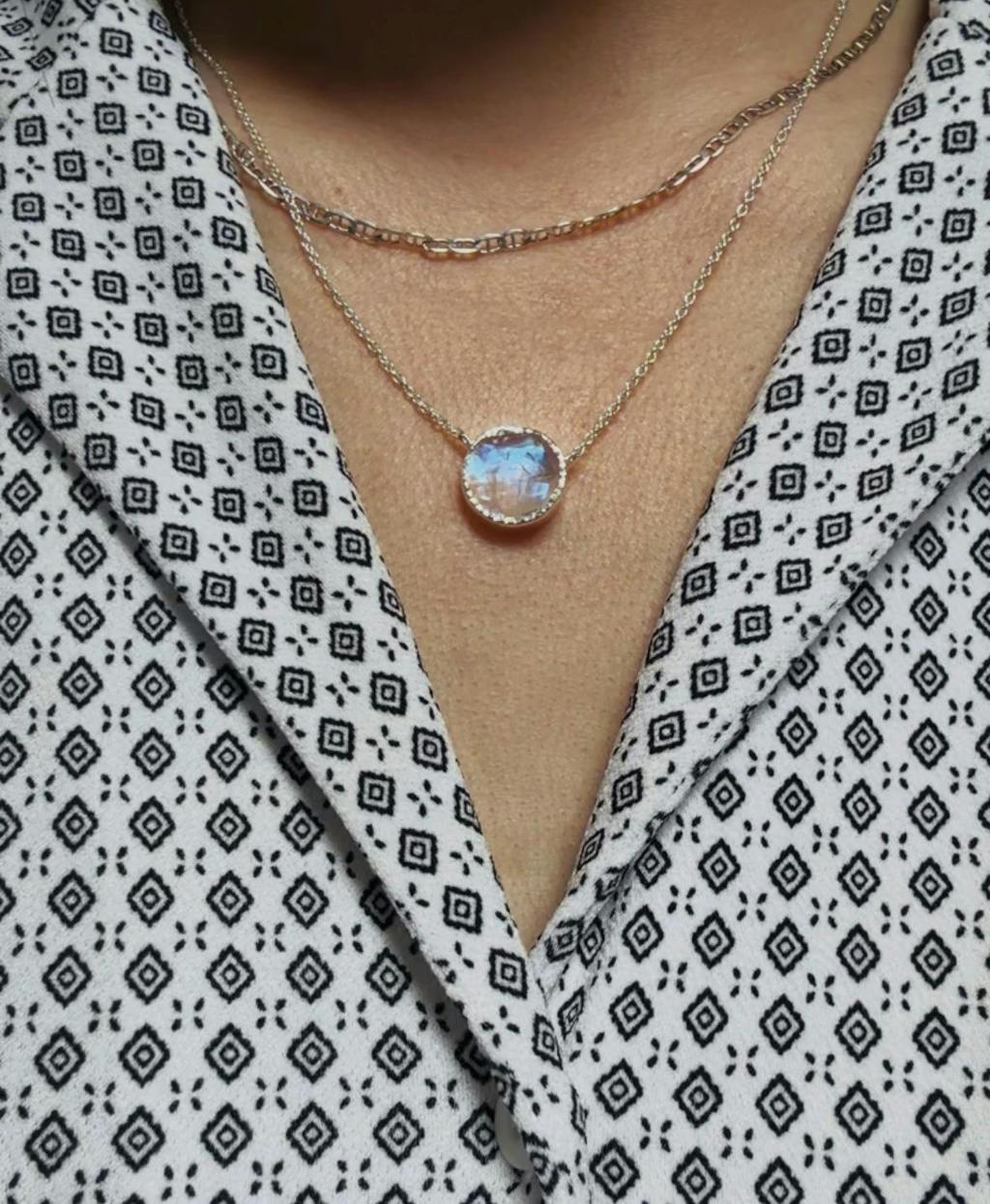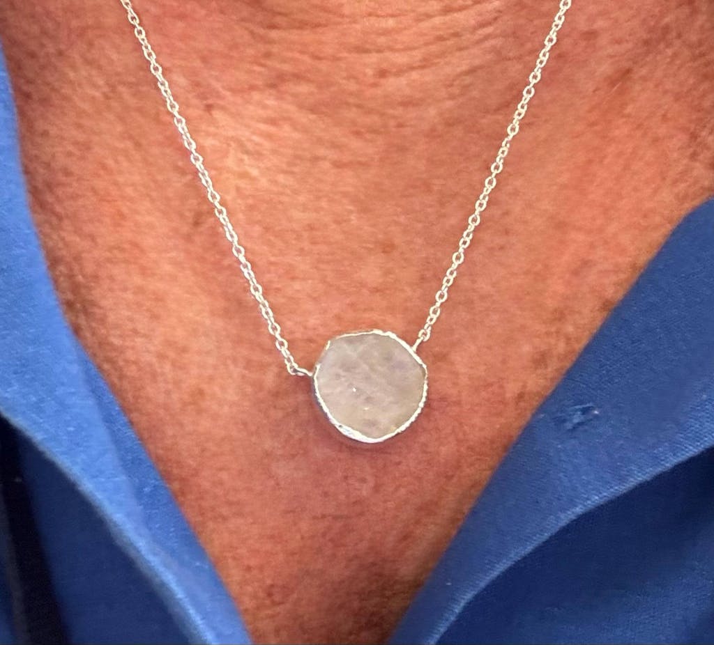 Stylish and unique, this raw moonstone necklace is the perfect accessory for any outfit. The natural beauty of the raw stone is complemented by the simple silver chain, making this necklace a must-have for any fashion-savvy individual. Whether you're dressing up for a special occasion or simply accenting your everyday style, this necklace is sure to turn heads.