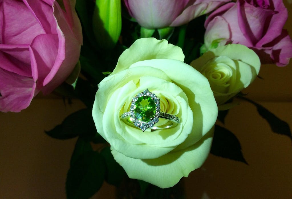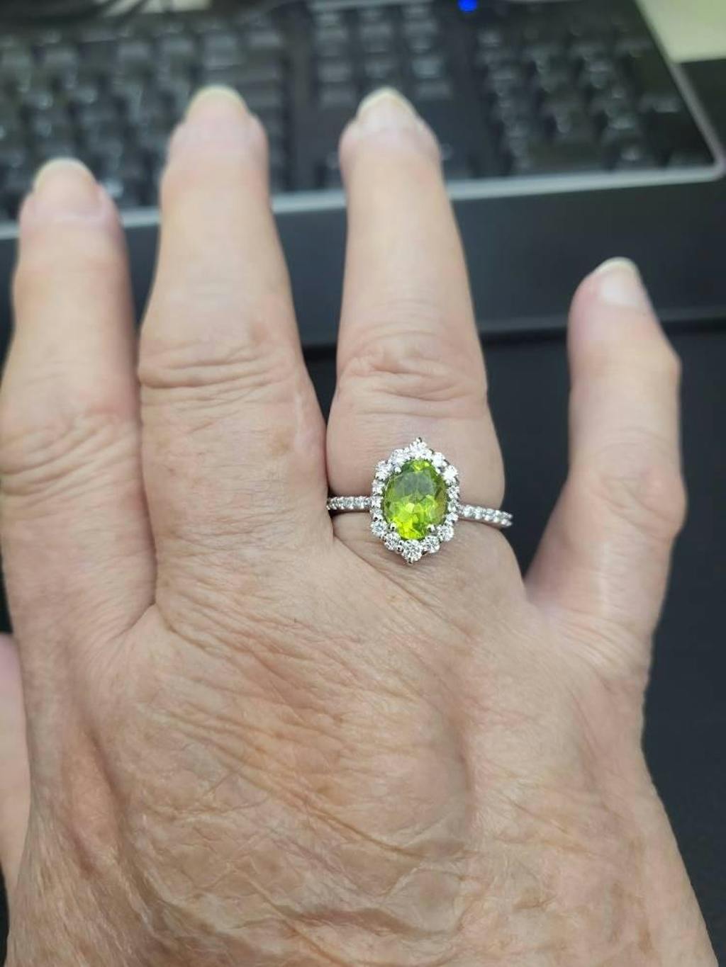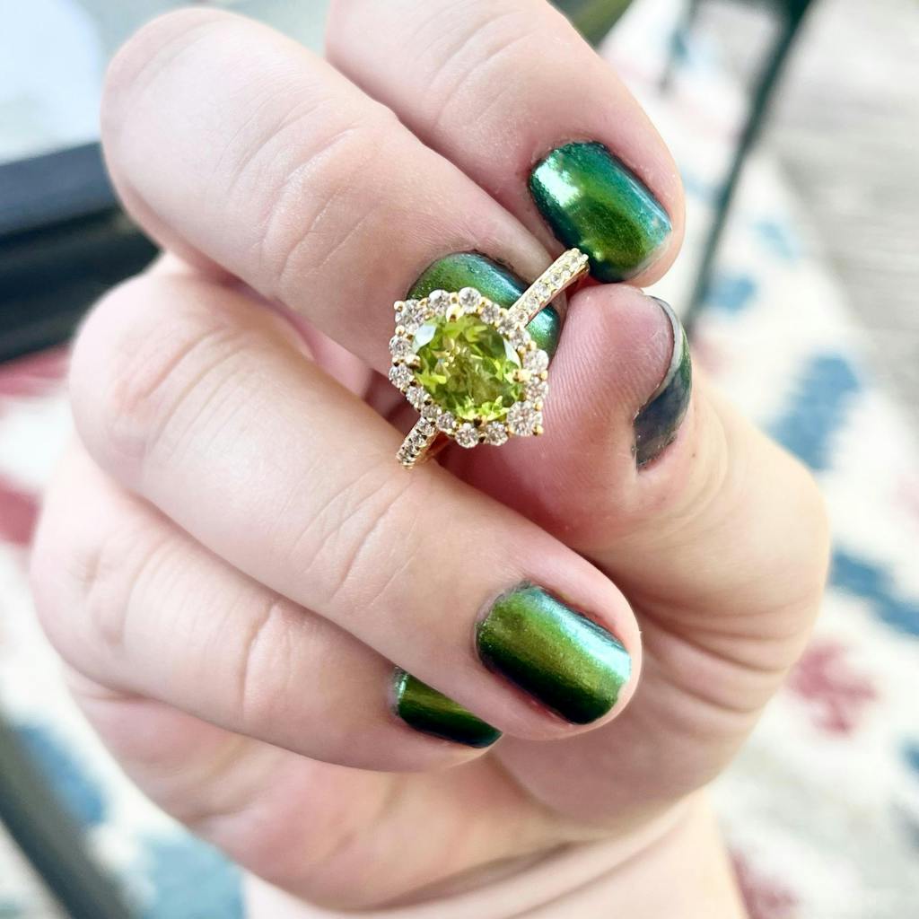 At the heart of this exquisite piece lies a stunning peridot gemstone. Known for its vibrant green hue, peridot is believed to bring about positivity, vitality, and prosperity. Wear this ring to add a touch of vintage glamour to any outfit while embracing the positive energy of peridot.